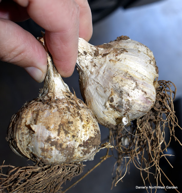 The bigger garlic heads are Music, the smaller ones are Spanish Roja, I think. I'll save about 5 of the largest to plant next year. Raised bed, inside fence, made a big difference. Animals didn't eat them and they did really well. The fall planted ones were bigger than the spring planted ones/