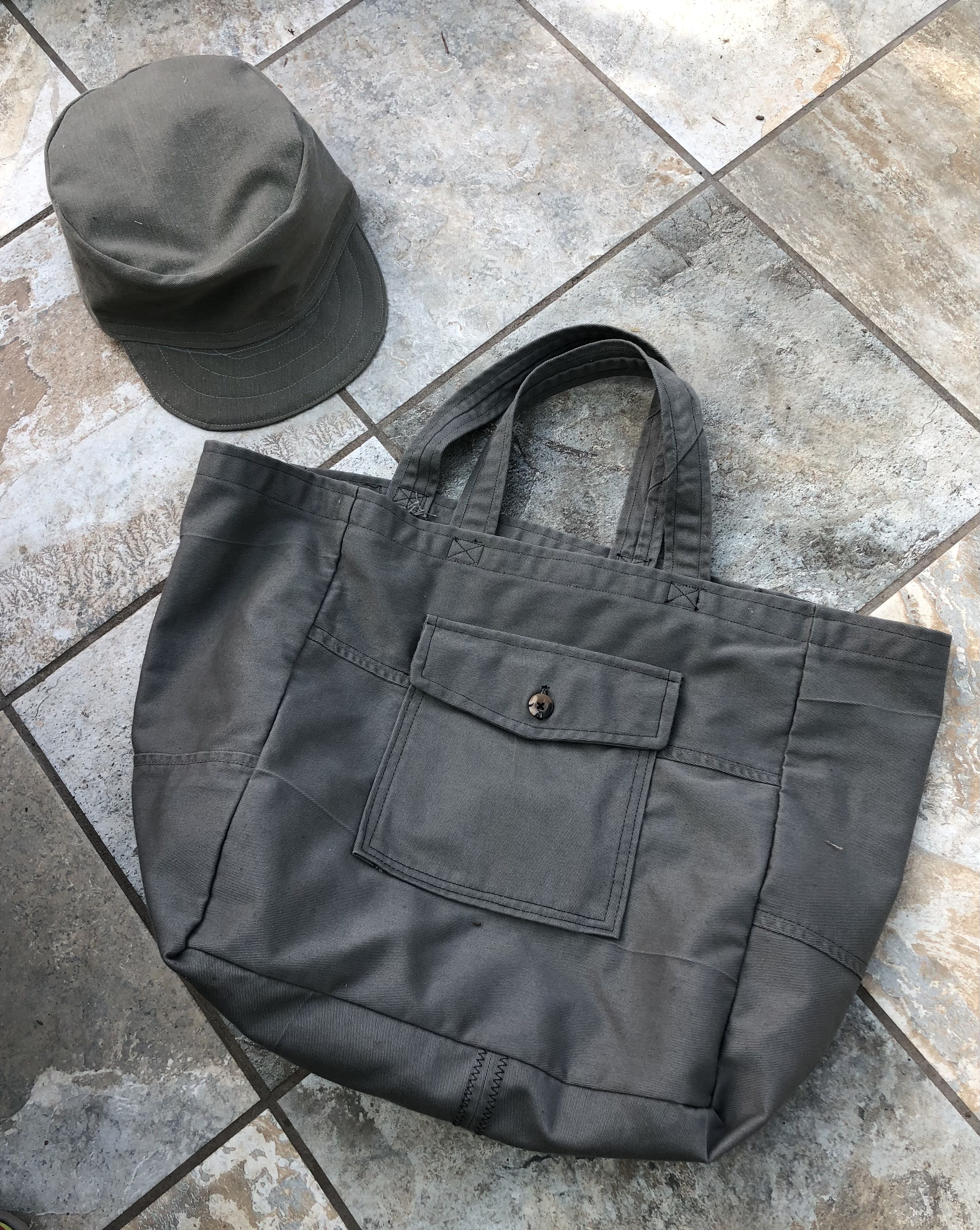 I found an old canvas Trader Joe's grocery tote that had shrunk too much when washed, to hold much groceries. That is the outer shell. The liner is a soft cotton shirt. I used the old (late '50s / early 60's) Morse (Toyota?) sewing machine to see if I can sew with it. It works nicely but takes some practice. Unlike the newest sewing machine, it doesn't skip stitches when encountering a thick seam or hem. However, the stitches look a little less tight.
