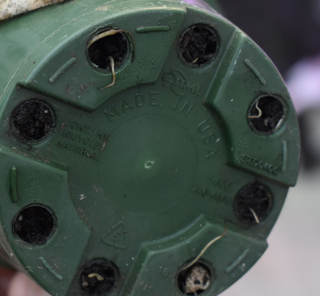 These are the sweetpea seedlings I planted yesterday. They were sort of unintended. I hadn't seen the ones that I planted directly emerge, so I started these just in case. Since then, the others did emerge. I planted these against some deer fencing in a location where they should get Western sunshine, although there will be some shade. I can compare how they do, with others that will not be shaded.