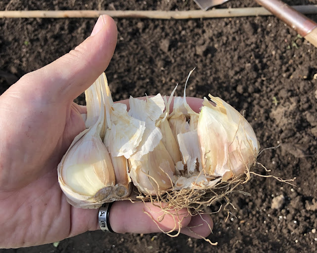 Each year, I set aside enough if the garlic harvest to plant the crop for the following year. Each bulb usually has six to ten cloves, which makes a row in my garden. This year, I planted four rows of Music garlic (hardneck) and four rows of Lorz (softneck) garlic. Supposedly, softneck will keep longer although last year the hardneck Music kept nearly a year.