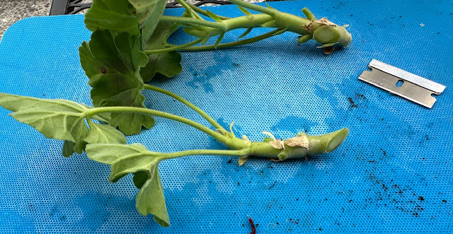 First step. Removing a strip of bark (girdling). I used a single edge razor blade, and pushed it into the bark. Then around, sort of like a copper pipe cutter. Then must peel off that section of bark.